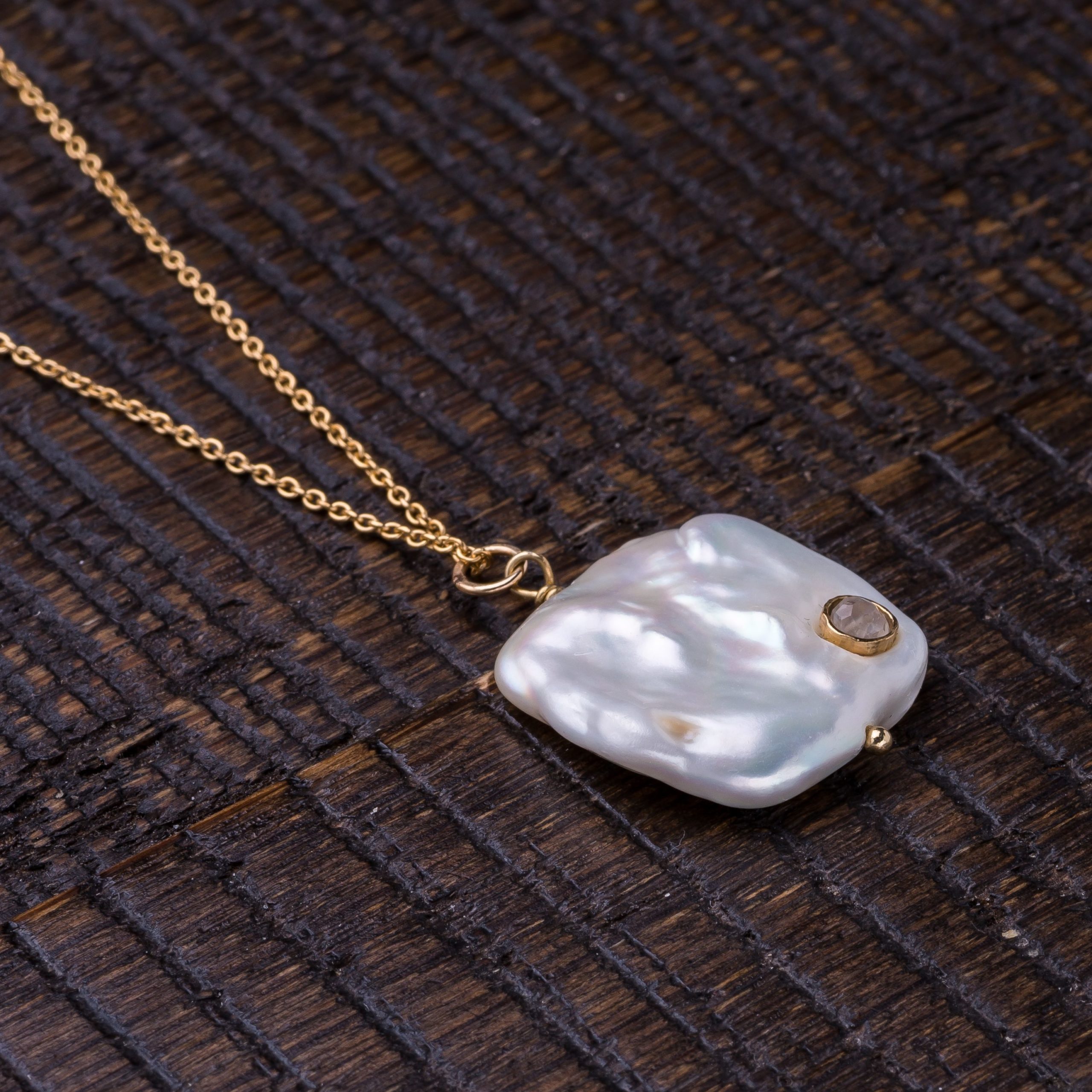 Square cultured pearl with faceted moonstone beauty mark on dainty chain.