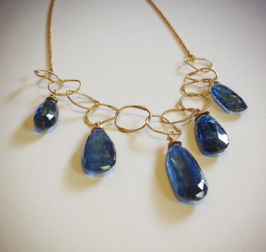 One of a kind 14k GF hammered dainty links necklace with Kyanite faceted teardrops.