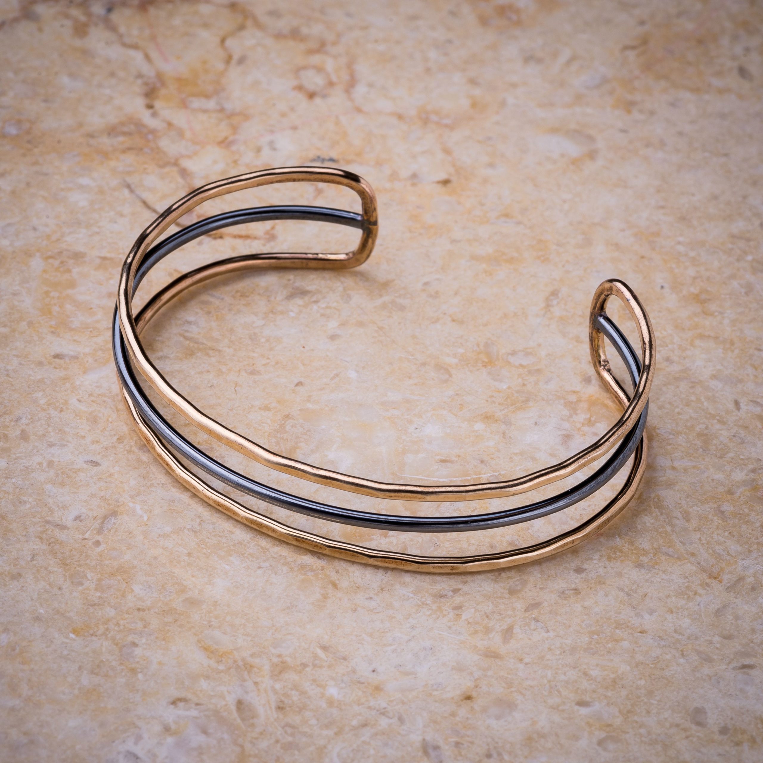 Oxidized sterling silver and 14k gold plated hammered cuff.